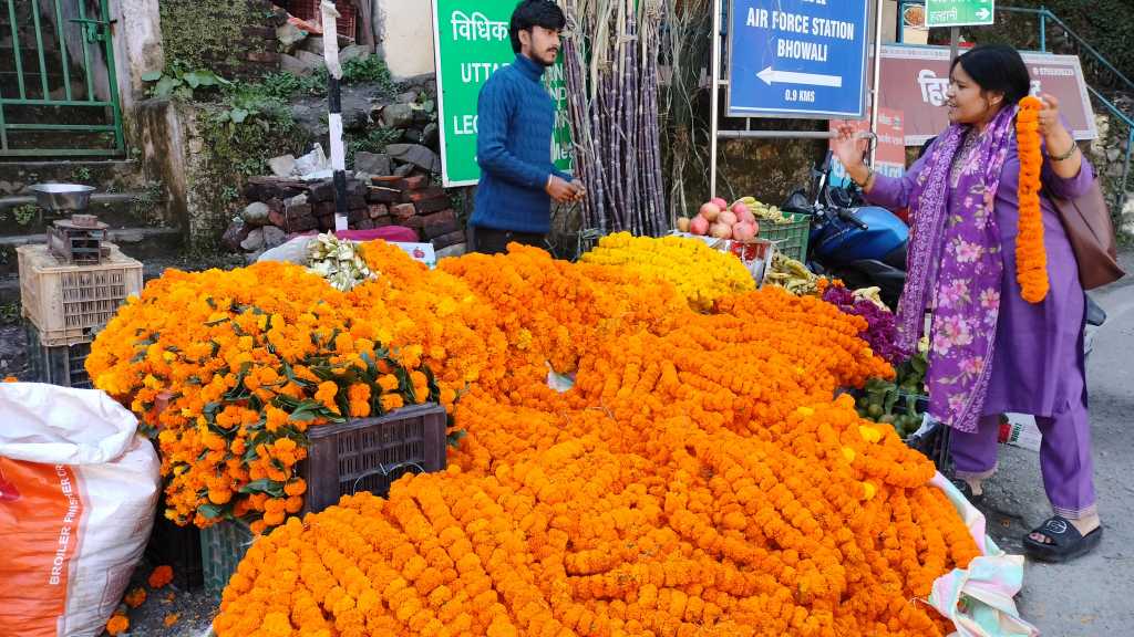 भवाली। दिवाली की रौनक देश भर के साथ उत्तराखंड की में भी जमकर देखी जा रही है। यहां भवाली बाजार में लोग जमकर खरीदारी करते नजर आ रहे हैं। घोड़ाखाल तिराहे पर नकुल गयाल इस बार गेंदे के फूलों के साथ माता लक्ष्मी के लिए कमल के फूल भी ग्रहकों के लिए लेकर आये है। कमल का फूल लोग पसंद कर रहे है। फूल की दुकान में भी इस बार जमकर खरीदारी देखी गई। उन्होंने बताया कि लोग हर साल कमल के फूल की डिमांड करते थे इस बार गेंदे के फूल के साथ कमल का फूल भी लेकर जा रहे है।