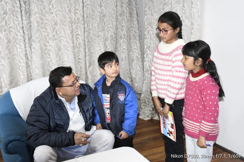 नैनीताल– सूबे के मुख्यमंत्री श्री पुष्कर सिंह धामी शनिवार को मुक्तेश्वर पहुंचे, जहां वह कुमाऊँ मंडल विकास निगम मुक्तेश्वर में पहुंचे थे कि केंद्रीय विद्यालय मुक्तेश्वर के तीन नन्हे मुन्ने बच्चे मुख्यमंत्री से आकर मिले। अपने बीच मुख्यमंत्री को देख बच्चे काफी उत्साहित थे, केंद्रीय विद्यालय में कक्षा छठी की छात्रा करुणा और कक्षा तीसरी की छात्रा रुचि और कक्षा एक के छात्र शैलेश पांडे ने मुख्यमंत्री से मुलाकात की । इस दौरान सीएम धामी भी बच्चों को देख काफी प्रफुल्लित हुए उन्होंने नन्हे-मुन्ने बच्चों से बातचीत की और उनका हालचाल जाना और उनकी पढ़ाई के बारे में भी पूछा। इस दौरान बच्चे सीएम से मिलकर काफी खुश नजर आए उन्होंने सीएम धामी का ऑटोग्राफ भी लिया।