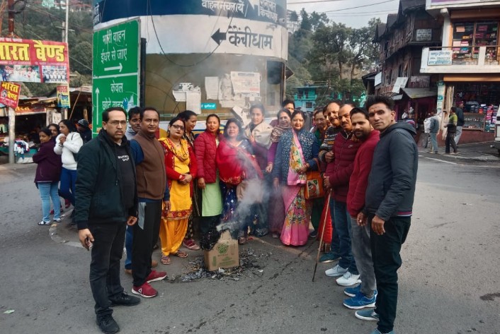 भवाली। सदन में विधानसभा अध्यक्ष ऋतु खंडूरी के साथ कांग्रेसी विधायको के व्यवहार से भाजपा कार्यकर्ताओं में काफी आक्रोश है। आक्रोशित भाजपाइयों ने गुरूवार को मुख्य चौराहे पर कांग्रेस के विधायकों का पुतला दहन कर जोरदार नारेबाजी की गई। मंडल अध्यक्ष पंकज अद्वैती ने बताया कि कांग्रेसी विधायको का विधानसभा अध्यक्ष के साथ किया गया अमर्यादित व्यवहार निंदनीय है। सभी भाजपाई इससे आहत हुए है। जिसके विरोध में मुख्य चौराहे पर कांग्रेसी विधायको का पुतला दहन किया गया। इस दौरान मंडल अध्यक्ष महिला मोर्चा भगवती सुयाल, नीमा बिष्ट, उमा पढालनी, प्रगति जैन, वर्षा आर्य, रेशमा खान, तनुजा, नीमा, ज्योति साह, कंचन साह, मीना बिष्ट समेत कई लोग मौजूद रहे।