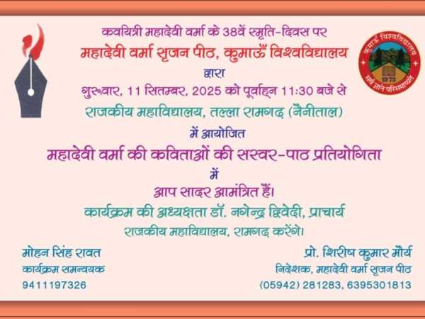 भवाली। कुमाऊँ विश्वविद्यालय की महादेवी वर्मा सृजन पीठ द्वारा कवयित्री महादेवी वर्मा के 38वें स्मृति-दिवस पर 11 सितम्बर को राजकीय महाविद्यालय, रामगढ़ में सस्वर कविता-पाठ प्रतियोगिता का आयोजन किया जाएगा।….
