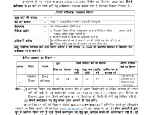 उत्तराखंड लोक सेवा आयोग ने रिजर्व बंदी रक्षक के 47 पदों पर भर्ती निकाली है और आवेदन मांगे हैं। रिजर्व बंदी रक्षक के 47 पदों पर अभ्यर्थी 18 जनवरी तक….