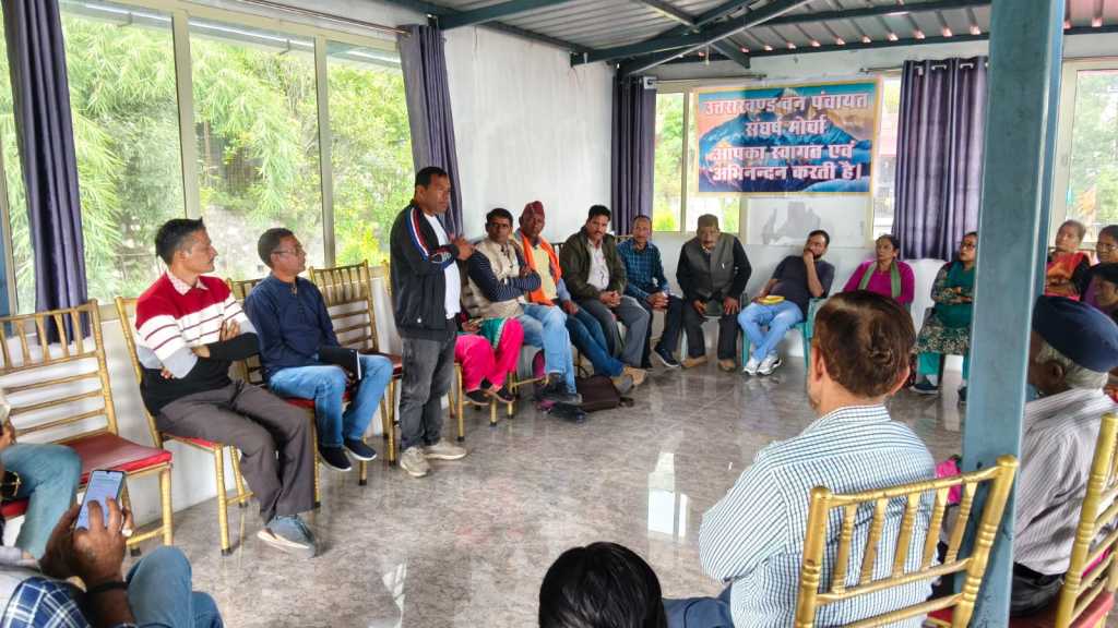 भवाली। नगर के कैलाश व्यू में शनिवार को वन पंचायत संघर्ष मोर्चा उत्तराखंड की जिला स्तरीय बैठक का आयोजन किया गया। बैठक में सर्वसहमति से वन पंचायत संघर्ष मोर्चा, नैनीताल जिला कार्यकारिणी का गठन किया गया, जिसमें प्रयाग सिंह जीना को अध्यक्ष, कमलेश जीना कोषाध्यक्ष, कमल सुनाल सचिव, भीम सिंह नेगी संयोजक, हिम्मत सिंह सह संयोजक, सरस्वती रौतेला महिलाप्रतिनिधि चुना गया। बैठक में वन पंचायतों के माइक्रोप्लान की स्थिति, वन पंचायतों की रॉयल्टी की धनराशि का वितरण तथा इन मुद्दों को लेकर हाईकोर्ट में याचिका दायर करने की तैयारी पर विस्तृत चर्चा की गई। संगठन ने निर्णय लिया कि आगामी दिनों में वन पंचायतों के अधिकारों की रक्षा हेतु व्यापक स्तर पर अभियान चलाया जाएगा। सभी ब्लॉकों में जनपद कार्यकारिणी के निर्देशानुसार बैठकें आयोजित की जाएँगी। बैठक के समापन में सामूहिक संकल्प लिया गया कि वन पंचायतों की स्वायत्तता एवं अधिकारों की बहाली हेतु संघर्ष को और तेज किया जाएगा।संचालन जिला संयोजक गोपाल लोधियाल ने किया। इस दौरान तरुण जोशी, भीम सिंह नेगी, हिम्मत सिंह गौड़ा, सरस्वती रौतेला, जगदीश चन्द्र, कमल सुनाल, वीना बिष्ट, कमलेश जीना, गोपाल लोधियाल रहे।