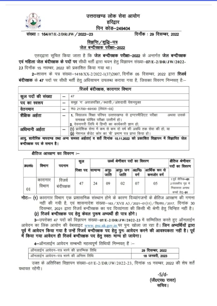 उत्तराखंड लोक सेवा आयोग ने रिजर्व बंदी रक्षक के 47 पदों पर भर्ती निकाली है और आवेदन मांगे हैं। रिजर्व बंदी रक्षक के 47 पदों पर अभ्यर्थी 18 जनवरी तक ऑनलाइन आवेदन कर सकते हैं। लोक सेवा आयोग के सचिव का कहना है कि रिजर्व बंदी रक्षक के पदों पर भर्ती जेल बंदी रक्षक भर्ती परीक्षा के लिए जारी की गई नियम के तहत की जाएगी।